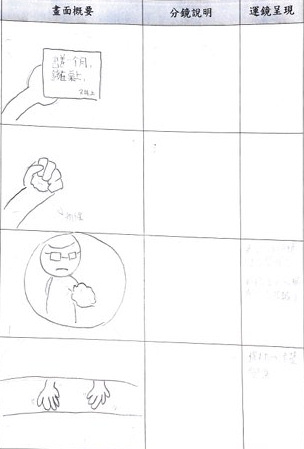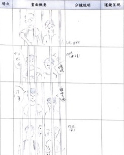繪製最簡略的分鏡圖來幫助我們了解劇情走向,過程一改再改。因為過程必須考量運鏡、地點、秒數、可行性、劇情邏輯等工作。